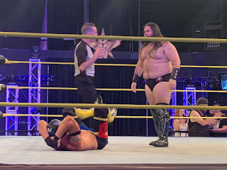 Skyler with a takedown, but Sierra back with a big boot. She splashes down on Skyler for 2. She runs into the corner with a double knee and Haley J is out at ringside. Tony Bizo sneaks out and trips her. Skyler hits a codebreaker for 2. Sierra comes back and takes Skyler down, but Haley is in the ring with the sock of rocks. Bizo grabs Sierra and holds her for Haley, but Luscious Lawrence is out to make the save and Bizo & Haley hightail it.