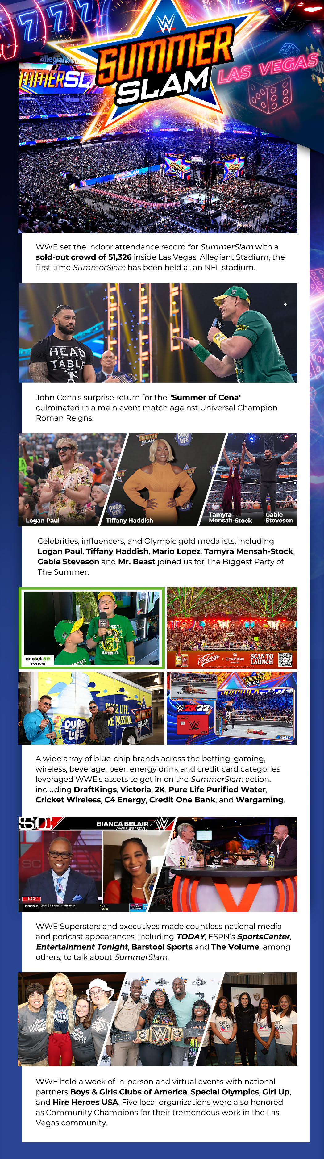 This past weekend, WWE held our biggest event of 2021, SummerSlam, emanating from Allegiant Stadium in Las Vegas with a record-breaking crowd of over 51,000 fans. More people watched Saturday’s event live across Peacock and WWE Network than any other SummerSlam in our company’s history, marking a 55% increase over 2020. SummerSlam also trended #1 worldwide, ahead of Pacquiao vs. Ugas and NFL preseason football.