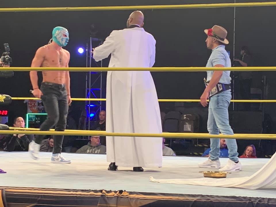 Reverend Ronnie Roberts is out for another edition of the Good Word. Tonight's special guest is Gustavo. Gustavo says he has the title, so he is still champion. Ronnie says Star Rider & Gustavo both had their cheering sections, but who's next? Gustavo says anyone can come step up to him. Ronnie says hold up, he has another special guest. It's Star Rider.