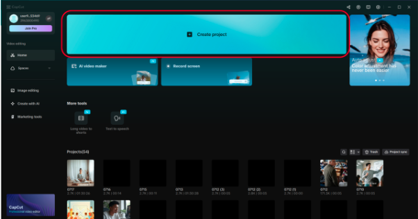 Go to the official site, download the CapCut Desktop Video Editor, and install it. Open the program and press the button that shows the option to "Create project" to open a new workspace where your investment strategy video is going to be made.