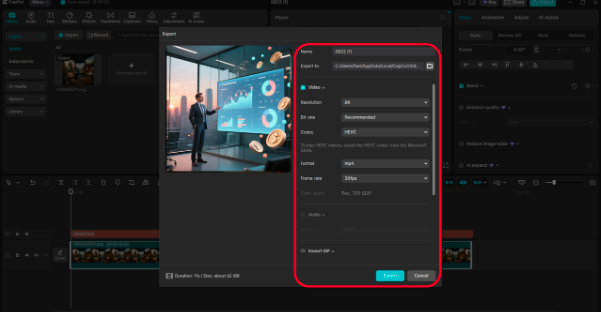 When you have finished editing, go to the upper right and find the button called "Export", where you will choose the resolution you desire, the format, and the location where the image should be saved. CapCut streamlines content to optimize across LinkedIn and YouTube, so that your strategy video appears professional on mobile and desktop.