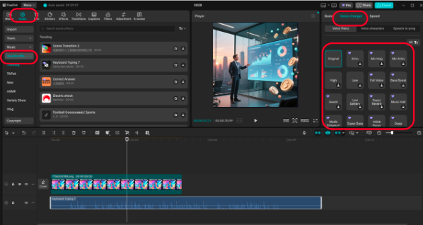 CapCut Desktop also has an in-built Voice Changer technique to make your investment video narration interesting. After importing or recording your audio, drag the audio into the audio track of the timeline. At the top of the interface, you can click on the "Audio" and on the left menu, on "Sound effects", then select any sound on the trending list.