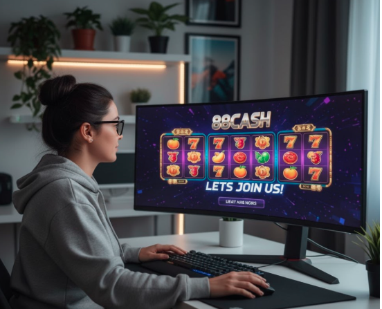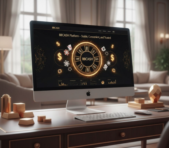 88CASH platform displayed on computer in luxury home office, representing stability and trust in online gaming.