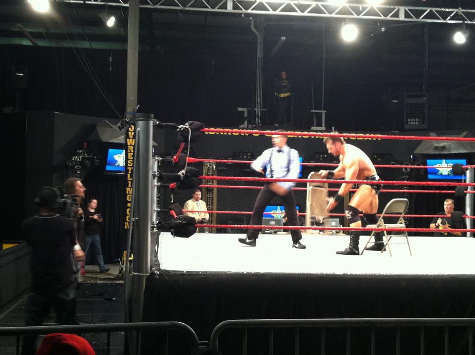 Barrett puts Kidd on the turnbuckles and he punches Kidd. Barrett sets for a superplex but Kidd punche Barrett off the turnbuckles and uses head butts. Kidd with a missile drop kick and he gets a near fall. Barrett charges at Kidd but Kidd drops down and Barrett goes over the top rope to the floor. Kidd with a running kick to the head and Barrett has trouble getting back to his feet.